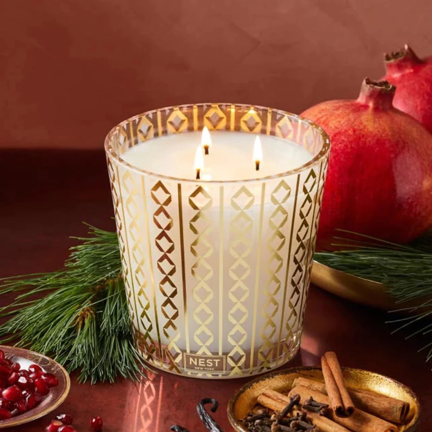 The quintessential aroma of the season is created by blending pomegranate, mandarin orange, pine, cloves, and cinnamon with a hint of vanilla and amber.Â